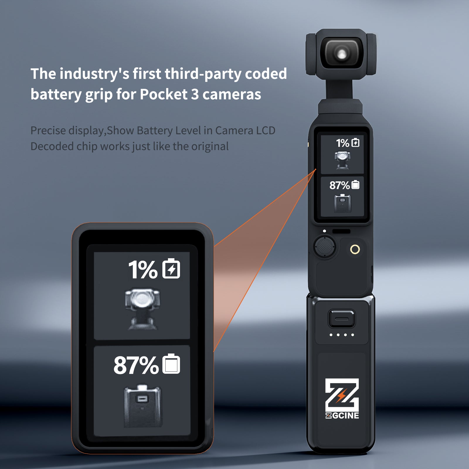 The industry's first third-party decoded battery grip for Pocket 3 cameras: accurately displays the battery grip level on the camera's LCD display.