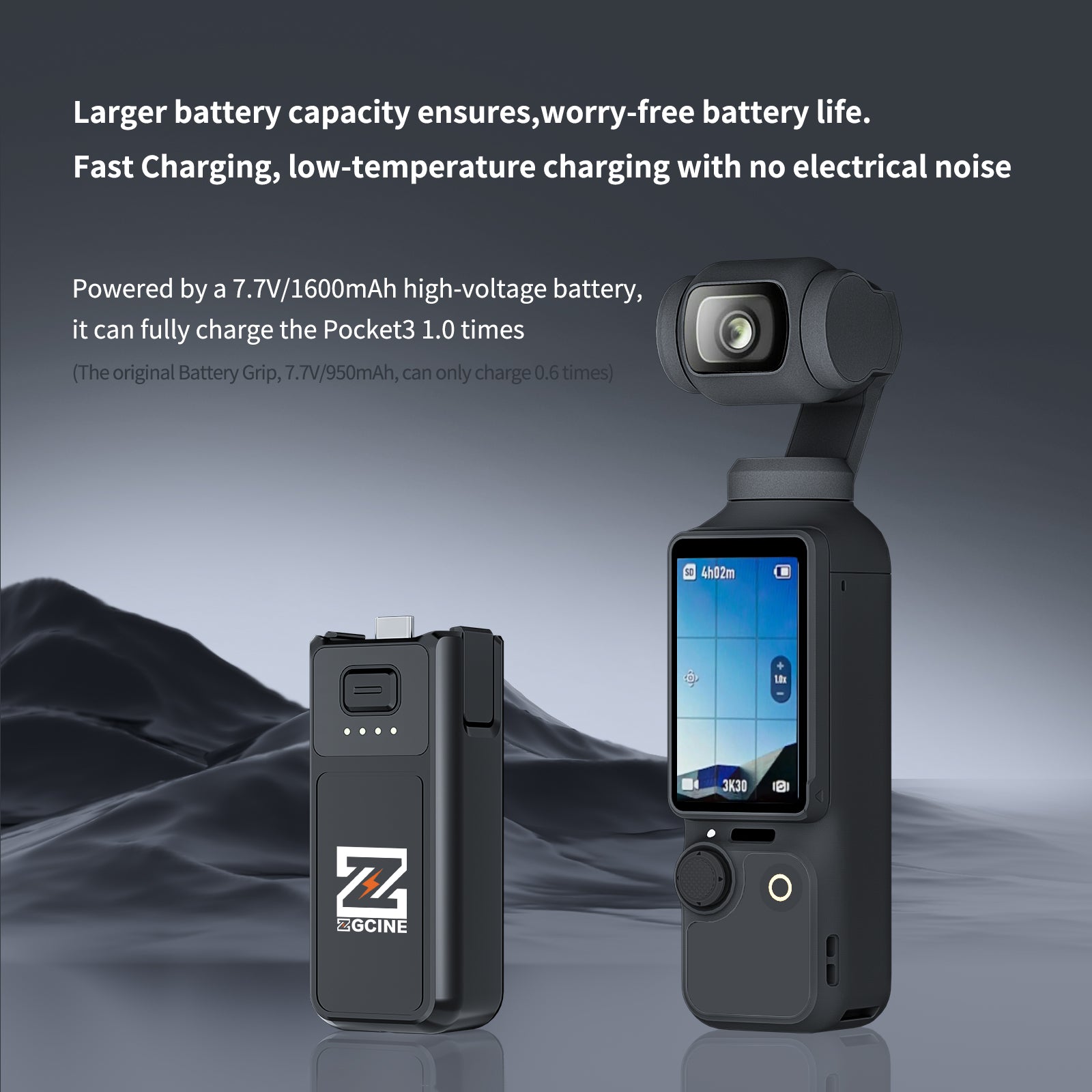 (The Pocket3 original Battery Grip, 7.7V/950mAh, can only charge 0.6 times.)