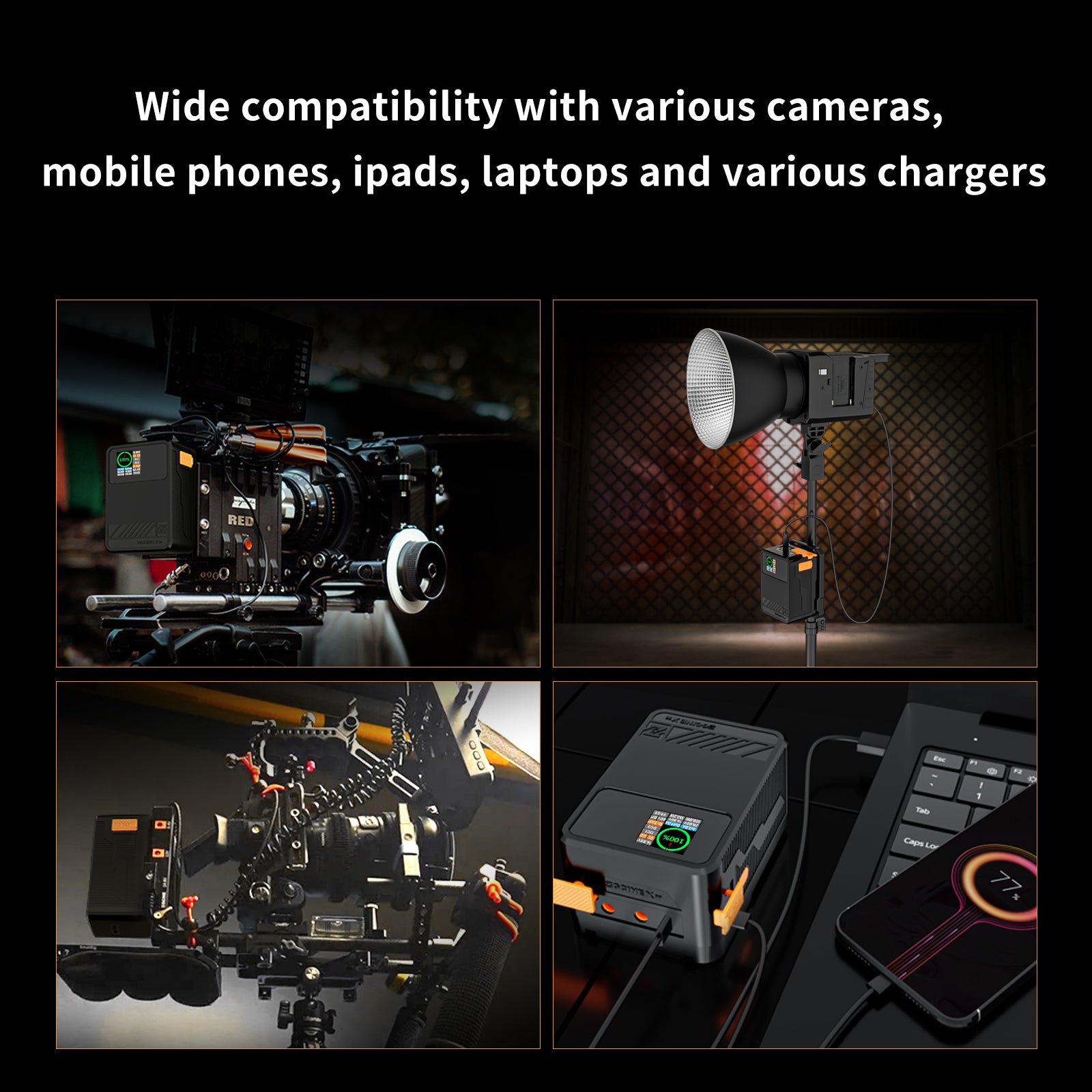 Compatible with A Wide Range of Devices: With Various types of output ports, the X99 V-mount battery works well for your Video Cameras, Camera Monitor, LED Video Light, Smartphones, Computers and other photography devices.