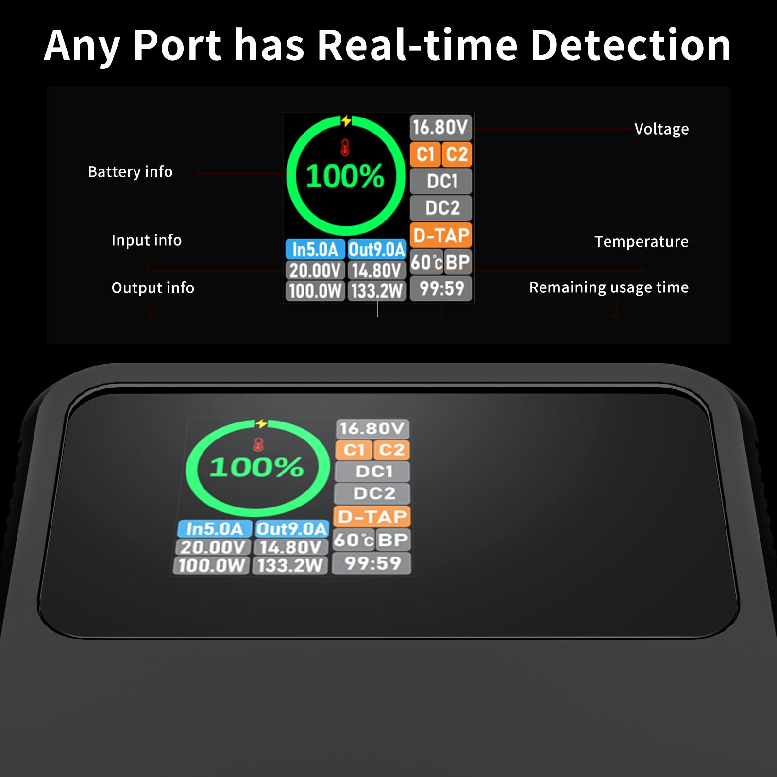1.3-inch IPS Screen: Full port identification, you can clearly see the current, voltage, total power, remaining time, temperature and other information of your device through the display.